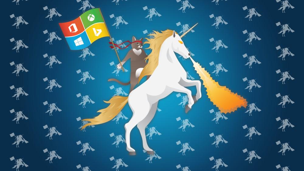 Uno de los logros de Microsoft con Windows 10 y el programa Insider es haber construido una comunidad de usuarios entusiastas en torno al sistema operativo. Y uno de los iconos de esta comunidad es el famoso "Ninja Cat Unicorn", una imagen de un gato ninja con una bandera de varios productos de Microsoft, montando sobre un unicornio que escupe fuego (inspirado en la imagen "Welcome to the Internet", de Jason Heuser).